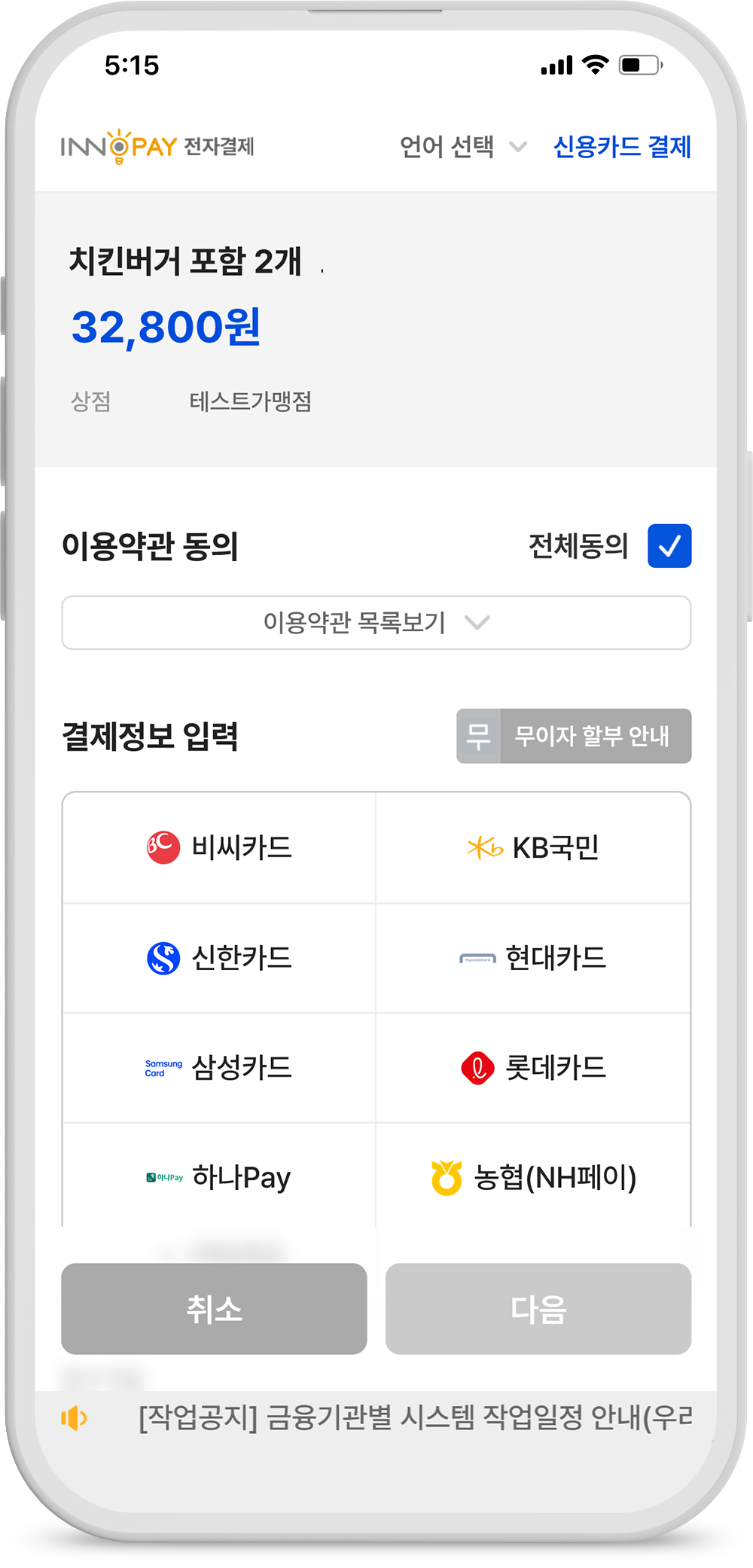 이노페이 키오스크는 다양한 결제 방법을 제공합니다.